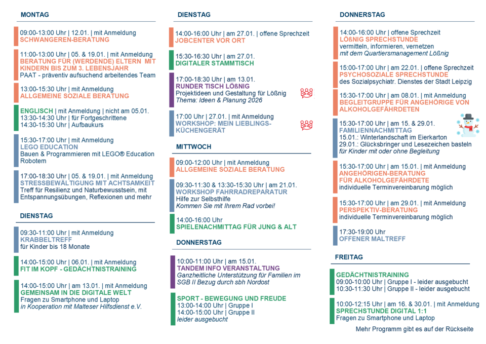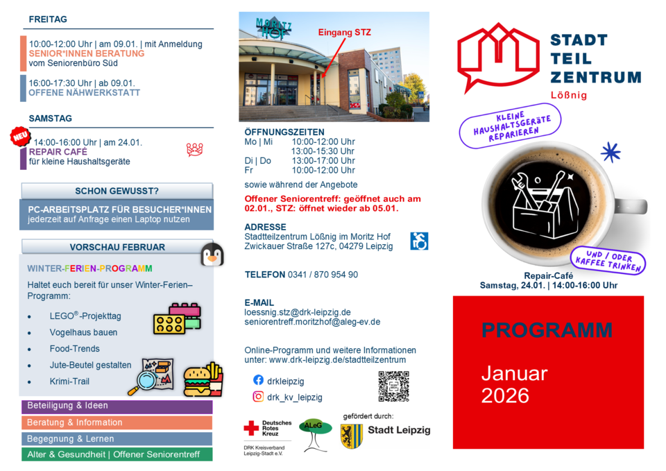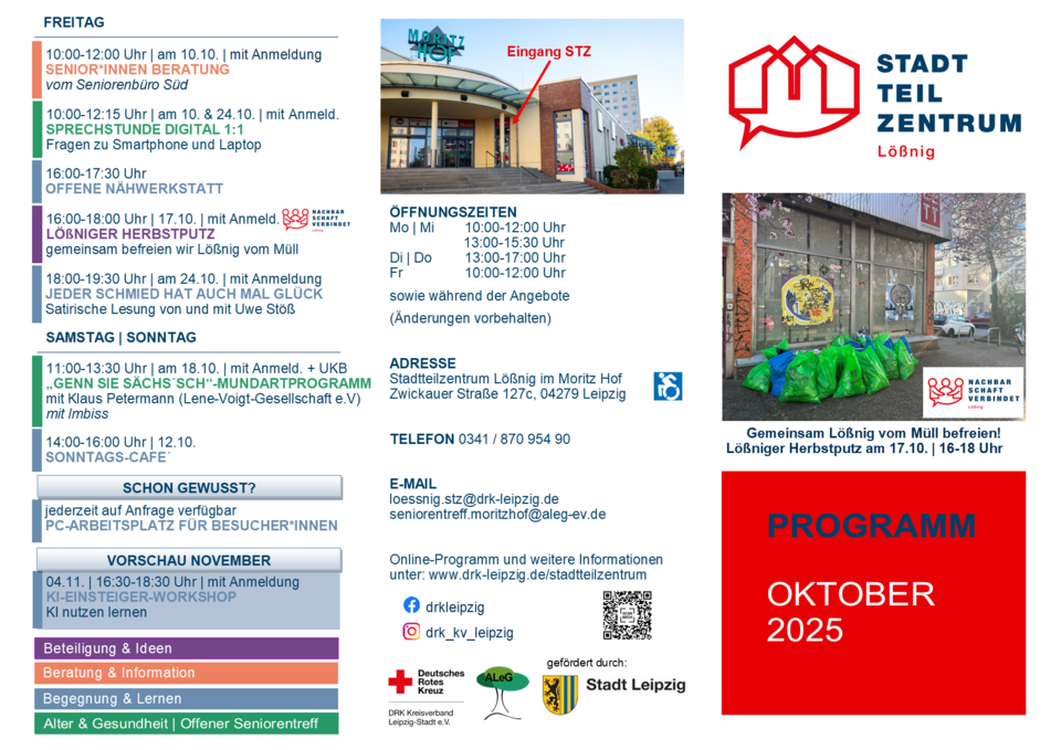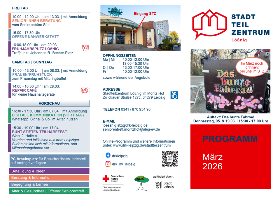 Das Stadtteilzentrum ist ein Begegnungsort für alle Generationen aus Lößnig und den umliegenden Stadtteilen Dölitz, Dösen und Marienbrunn. Unter einem Dach vereint es unter anderem Beratungs-, Beteiligungs- und Informationsangebote sowie einen Offenen Seniorentreff in Kooperation mit dem Verein Alter, Leben und Gesundheit e.V. (ALeG e.V.).