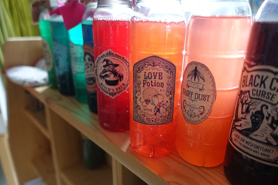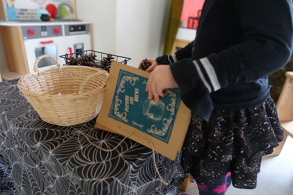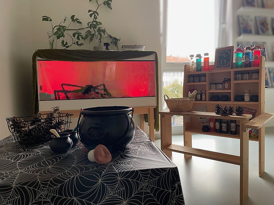 Mit gemeinsamer Zauberkraft entfachten wir das Licht im Halloweenkürbis. Danach ging es in verschiedene Themenräume: kreativ werden, in der Hexenküche den Zaubertank fürs Mittagessen vorbereiten, der draußen im Garten vom Hexengehilfen Tilo im Kessel gekocht wurde. Besonders beliebt war der Raum voller Luftballons, Tanzmusik und Halloweenspiele wie Besenreiten und Kürbiskegeln