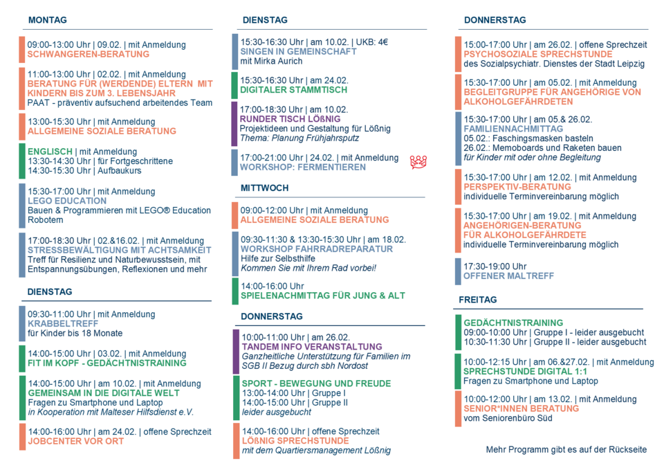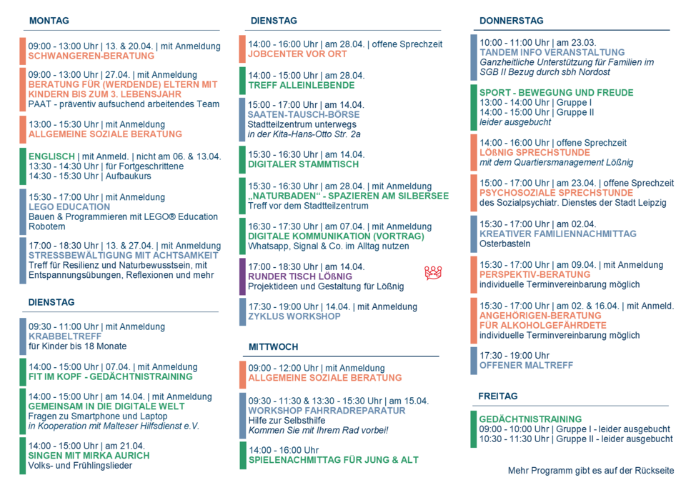 Das Stadtteilzentrum ist ein Begegnungsort für alle Generationen aus Lößnig und den umliegenden Stadtteilen Dölitz, Dösen und Marienbrunn. Unter einem Dach vereint es unter anderem Beratungs-, Beteiligungs- und Informationsangebote sowie einen Offenen Seniorentreff in Kooperation mit dem Verein Alter, Leben und Gesundheit e.V. (ALeG e.V.).